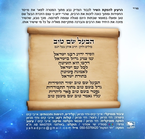 הרעיון להפקת השיר לכבוד הצדיק נבע מתוך המטרה לפאר את מייסד החסידות ומתוך כוונה לזכות את הרבים, שהרי ידוע כי עצם הזכרת הבעל שם טוב ופועלו במוצאי שבתות הינם סגולה גדולה לפרנסה.